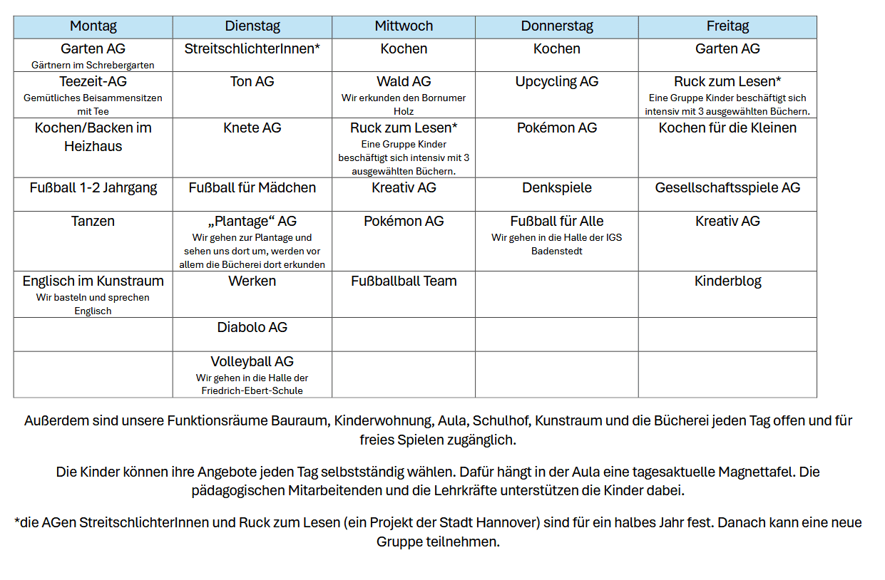 Außerdem gibt es ab sofort einen Überblick über die wöchentlichen AG-Angebote im Nachmittag. Hier ist der AG-Plan als Bild zu sehen und für spätere Orientierung findet er sich auch verlinkt auf der Team-Seite des Ganztags.